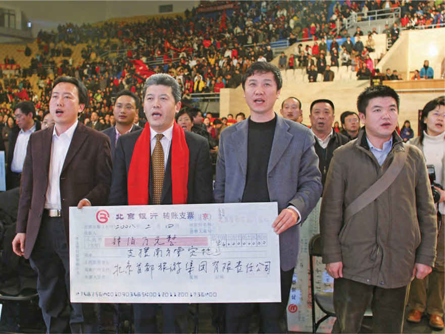 2008年2月,党委副书记、总经理 刘毅代表首旅员工和企业,为抗 击冰雪灾害捐款400万元